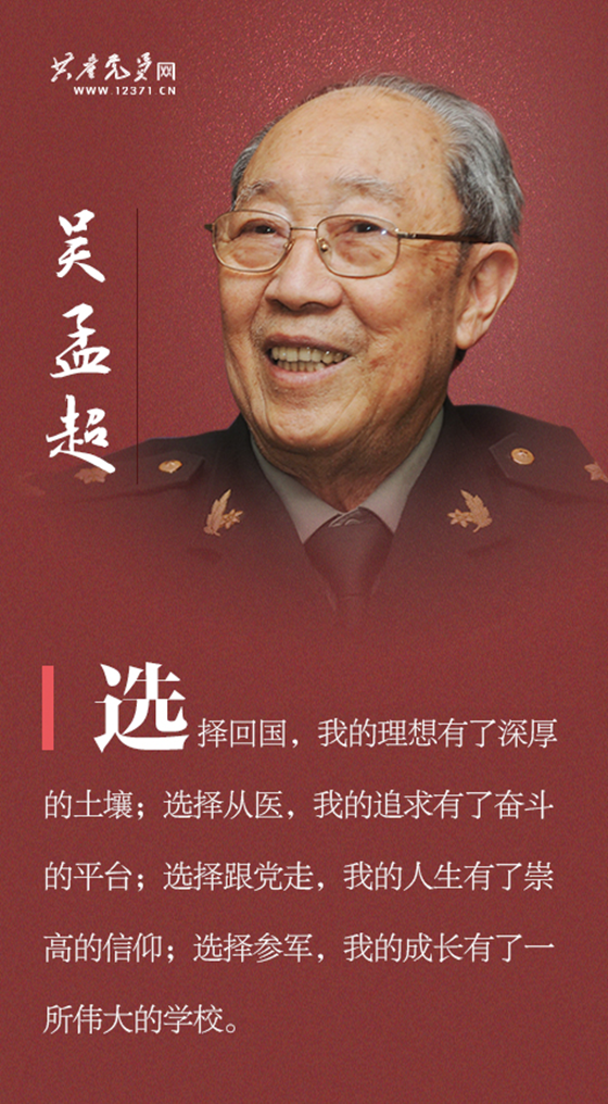 回想走过的人生路,吴孟超曾说:“选择回国,我的理想有了深厚的土壤;选择从医,我的追求有了奋斗的平台;选择跟党走,我的人生有了崇高的信仰;选择参军,我的成长有了一所伟大的学校。”