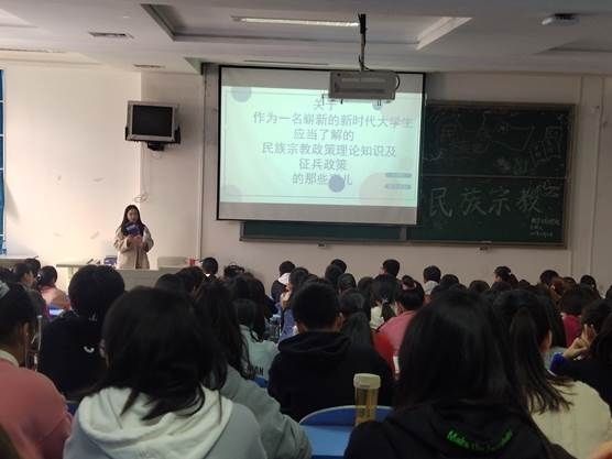 会议伊始,巴清茹老师向同学们讲述了党的十九大对多民族工作的重要论述,提出了多元一体格局,民族共同体意识。接着,巴清茹老师向我们介绍了社会民族关系,讲述了民族关系和社会民族关系基本知识,要正确认识民族关系主流,着力推动建立互相嵌入式的社会结构和社区环境。接下来,巴清茹老师向大家介绍了有关宗教知识和宗教工作,讲述了马克思主义宗教观和党的宗教政策,并且向大家说明了宗教、邪教和迷信的区别,提出国家保护正常的宗教信仰活动,向大家说明了共产党员、共青团员不可信仰宗教,不能相信校内宗教活动。最后,巴清茹老师向大家讲述了征兵要求,宣读了征兵政策。巴清茹老师介绍到,应征入伍时,优先分配给大学生,在此期间,会保留学籍或者事业编的单位工作,部队退役就可升学毕业,在此期间还有经济补助,最为之重要的是,征兵有利于个人发展,不仅锻炼意志和品质,也有利于外形气质、人际关系和情感教育的提升。会议结束,巴清茹老师说到,兴趣是最好的老师,同学们要培养学习兴趣,加强爱国主义。同学们纷纷表示此次会议受益匪浅。
