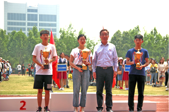 运动会上,我院运动员拼搏进取、奋勇争先,数学与统计学院取得了可喜的成绩:集体奖中,数学与统计学院荣获精神文明奖并获得了团体总分第三名的好成绩,数学与统计学院在此次方阵比赛中,荣获第四名。男子10×50穿针引线比赛中荣获第五名,女子10×50穿针引线比赛中荣获第二名,女子跳绳团体赛中荣获第二名,男子跳绳团体赛中荣获第六名,女子同舟共济比赛中荣获第一名,24人25足比赛中荣获第七名,女子4×100比赛中荣获第六名,男子4×100比赛中荣获第五名,垒球掷准比赛中荣获第四名;单人奖中,葛莎莎获女子800米第六名,张开心获男子800米第七名,董晓佩获女子100米第二名,李龙辉、闻政阳分别获男子铅球第七名与第八名,桥牌比赛中,杨梦洁与孙鸽鸽获第一名、孙瑾阳与王思佳获第二名、周晶与周路羽获第三名、韩瑞与张航菁获第四名、李曦与韩婷婷获第五名。2019年5月17日中午11点,本届运动会比赛成绩揭晓。由校领导依次为运动员代表颁奖,伴随着校长孙先科的闭幕词,历时将近三天的运动会结束,由校党委书记赵建宣布此次运动会正式闭幕。