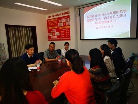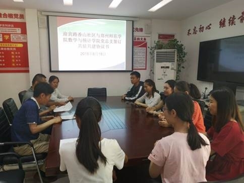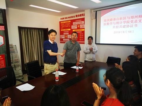 2019年6月18日,郑州师范学院数学与统计学院党总支与香山社区“共筑共建项目”协议签订仪式在香山社区居委会顺利举行。出席此次活动的有王建峰书记、刘含英老师、黄璟老师及几位党员同学。